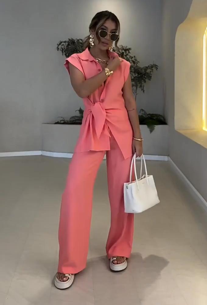 Damska koszula z krawatem i wysokim stanem, spodnie casualowe, dwuczęściowy zestaw