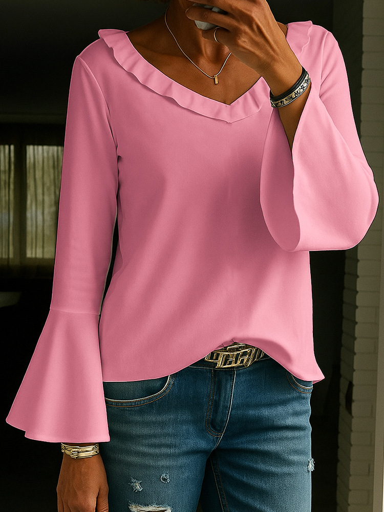Damska bluzka w jednolitym kolorze z rękawami typu trąbka i dekoltem w serek