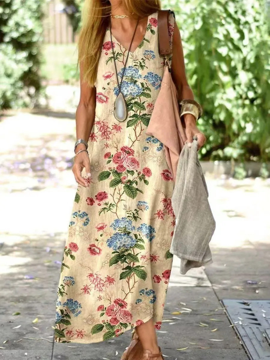 Damska sukienka bez rękawów z dekoltem w serek, nadrukiem kwiatowym, wykonana z bawełny i lnu